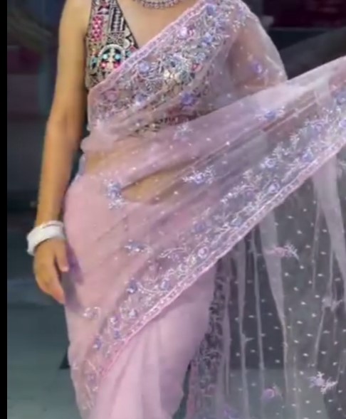 Baby Pink Floral Embroidered Net Saree with Designer Blouse