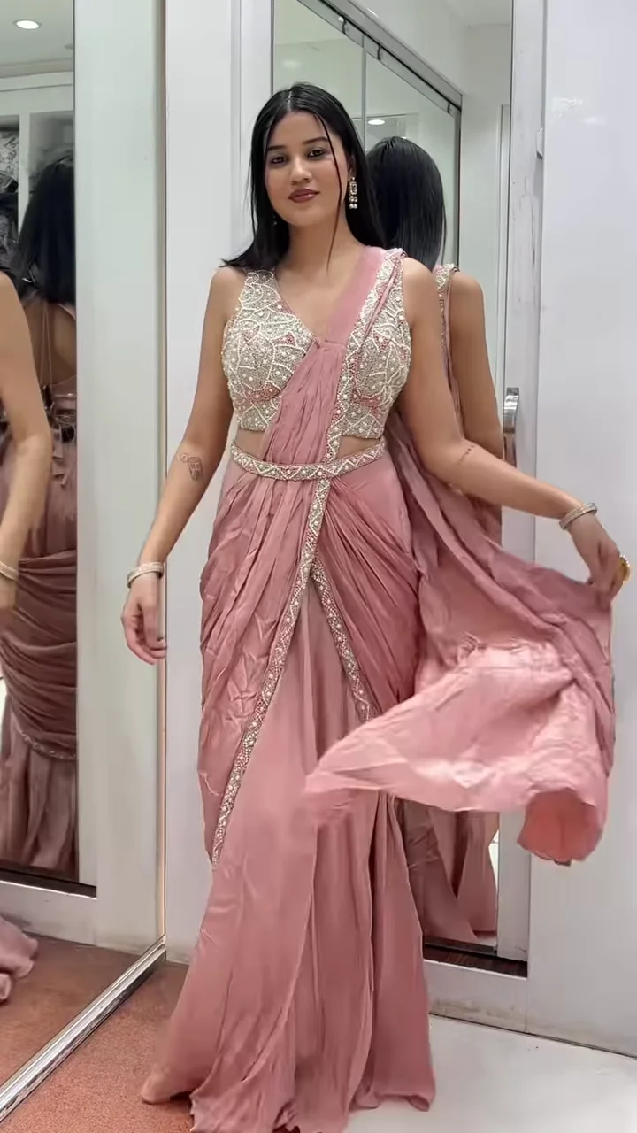 This Blush Pink Ruffled Pre-Stitched Saree is a modern twist on traditional elegance. The saree features soft satin crepe pleats that flow gracefully, while the intricately embroidered blouse adds a luxurious touch. The embellished belt detailing defines the waist for a flattering silhouette.