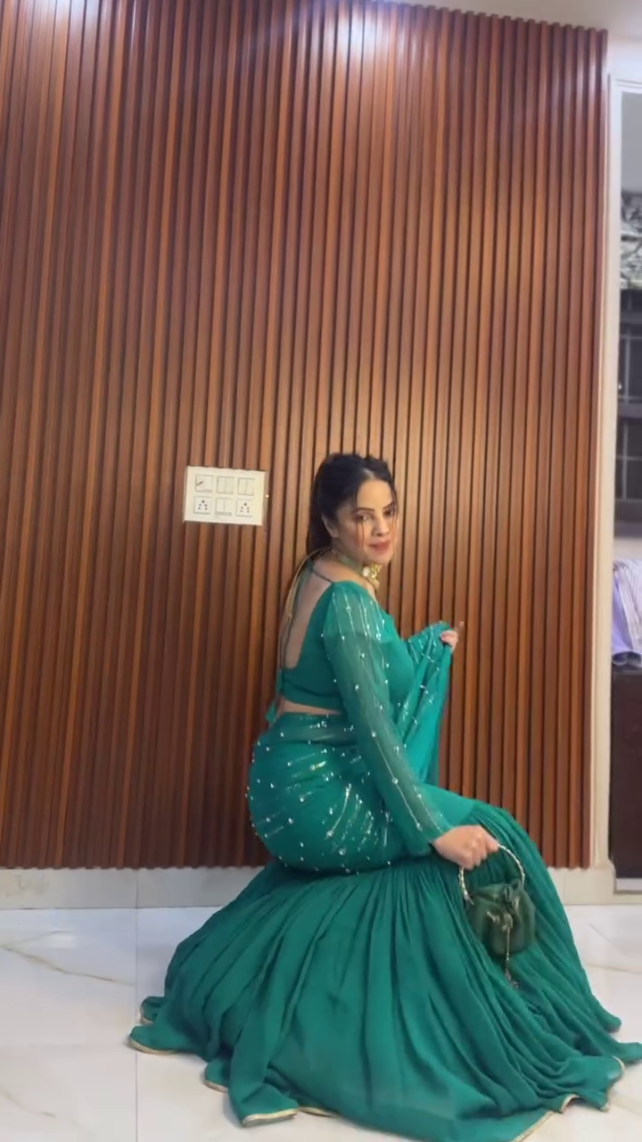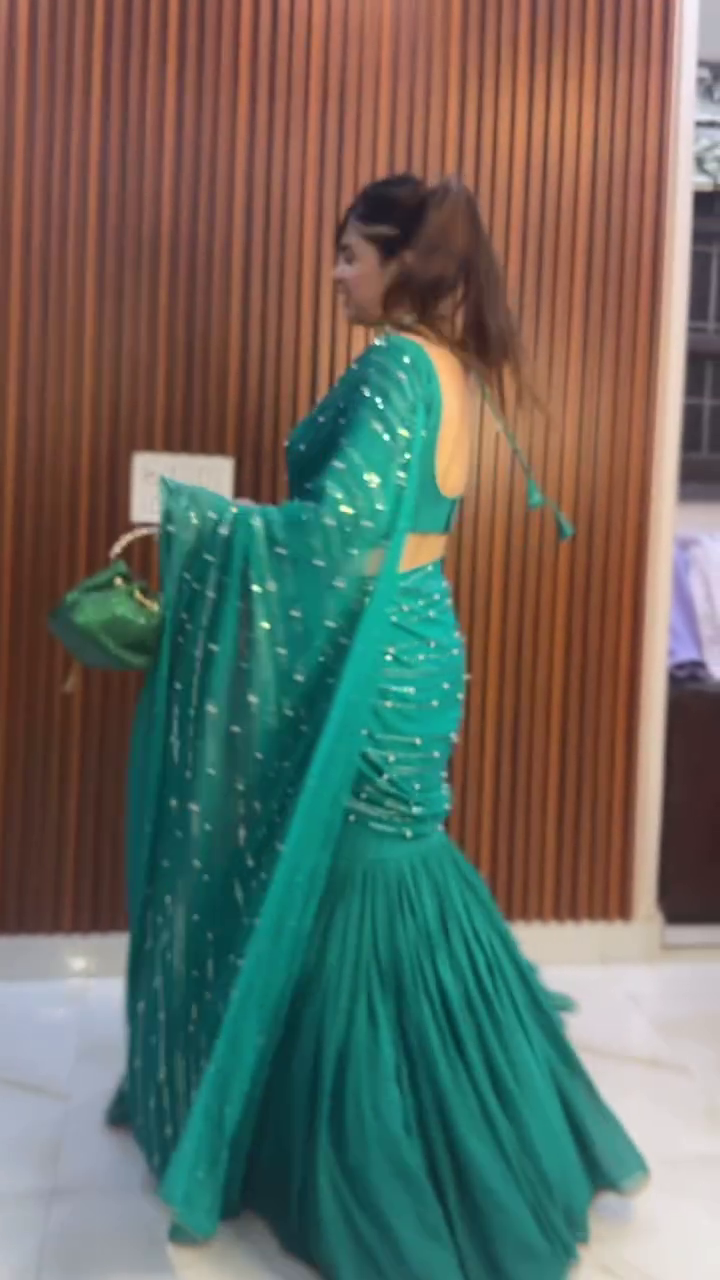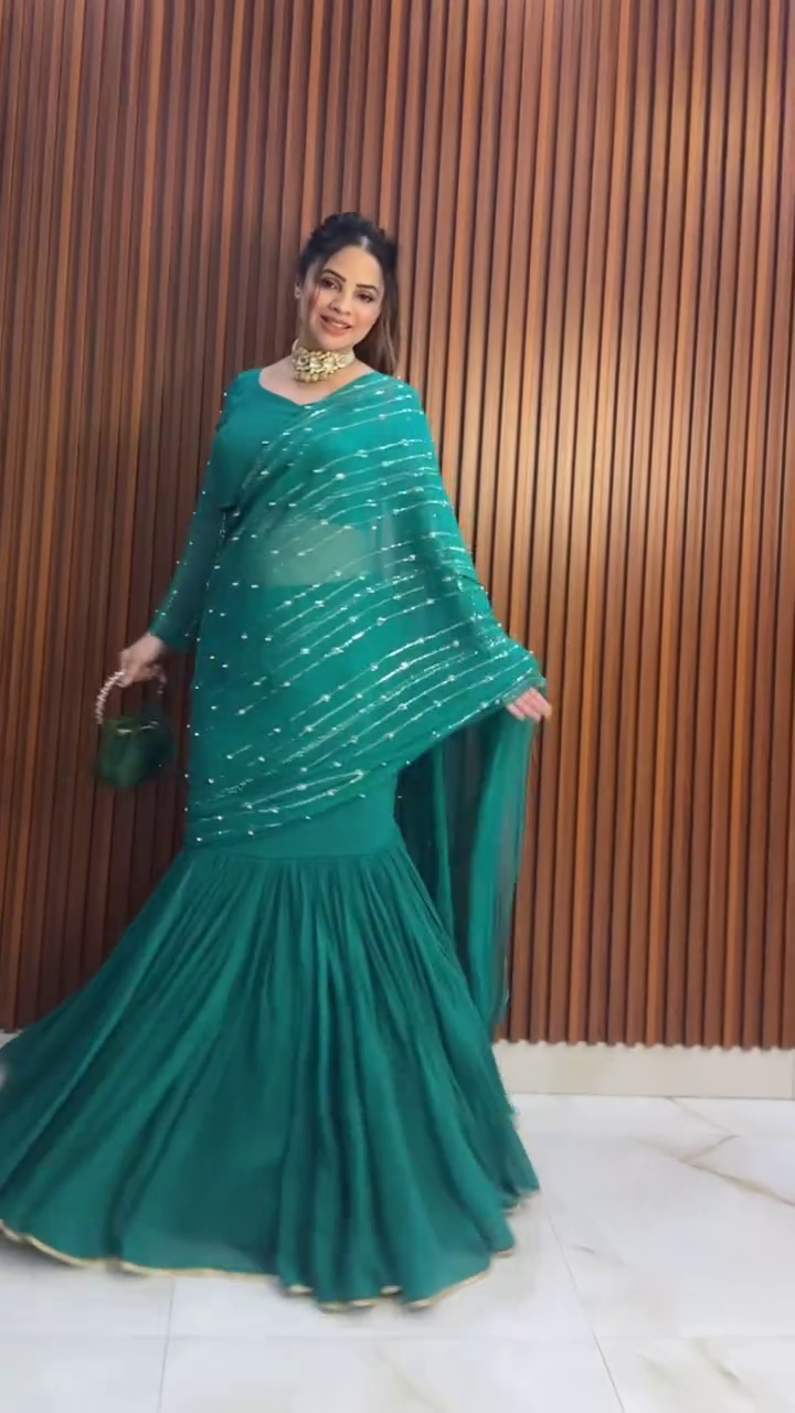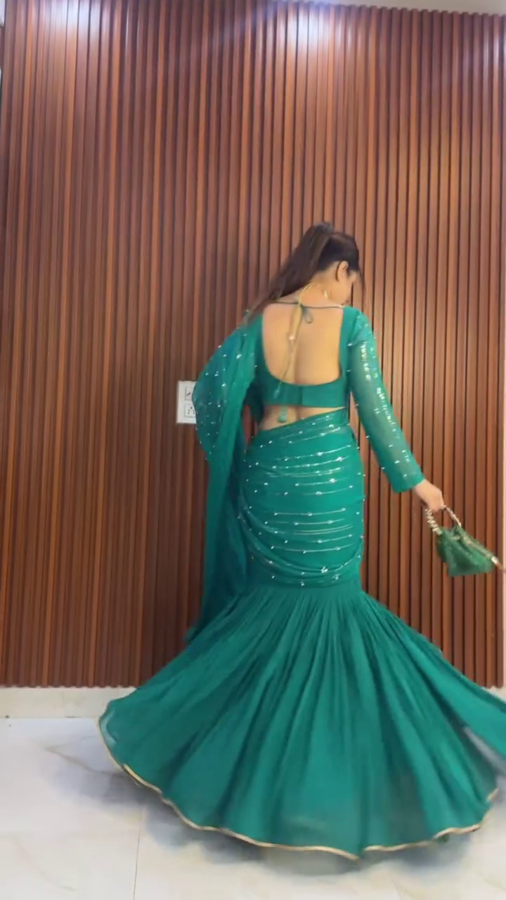 Title: Bottle Green Ruffle Saree Gown with Sequin Detailing