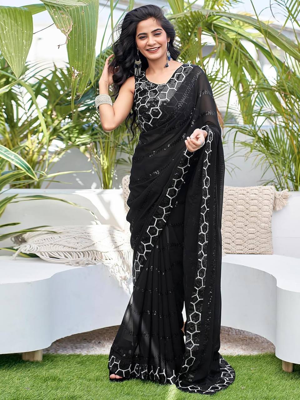 Embroidery With Sequence Work Black Color Saree