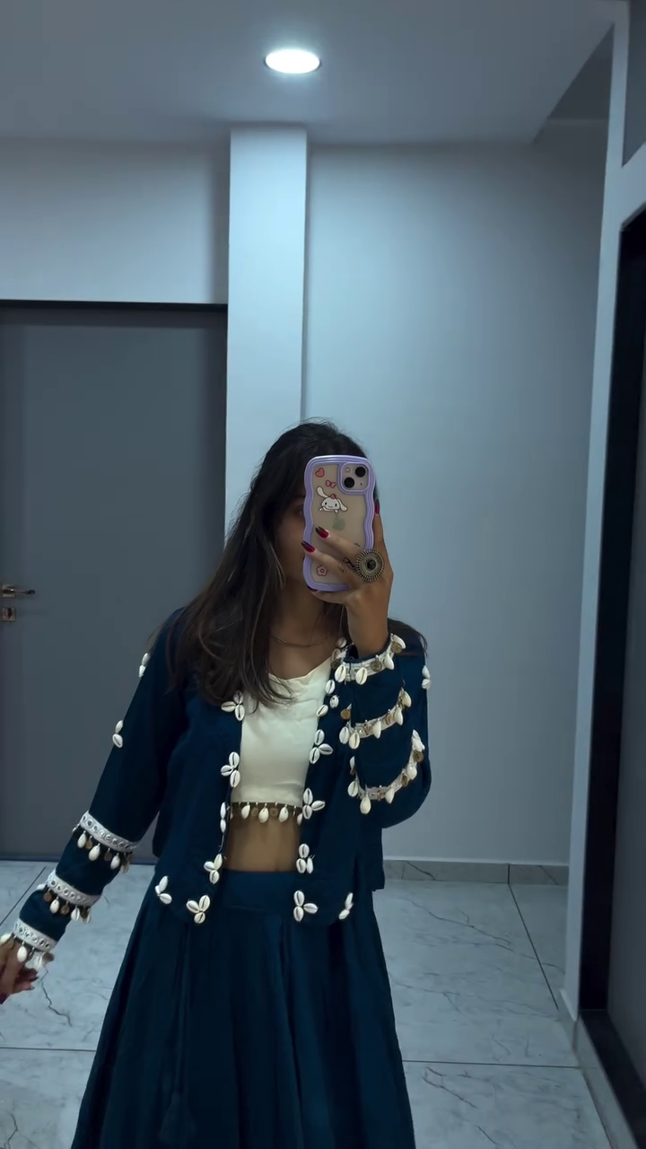 Navy Blue Shell Work Jacket Lehenga Set with Crop Top