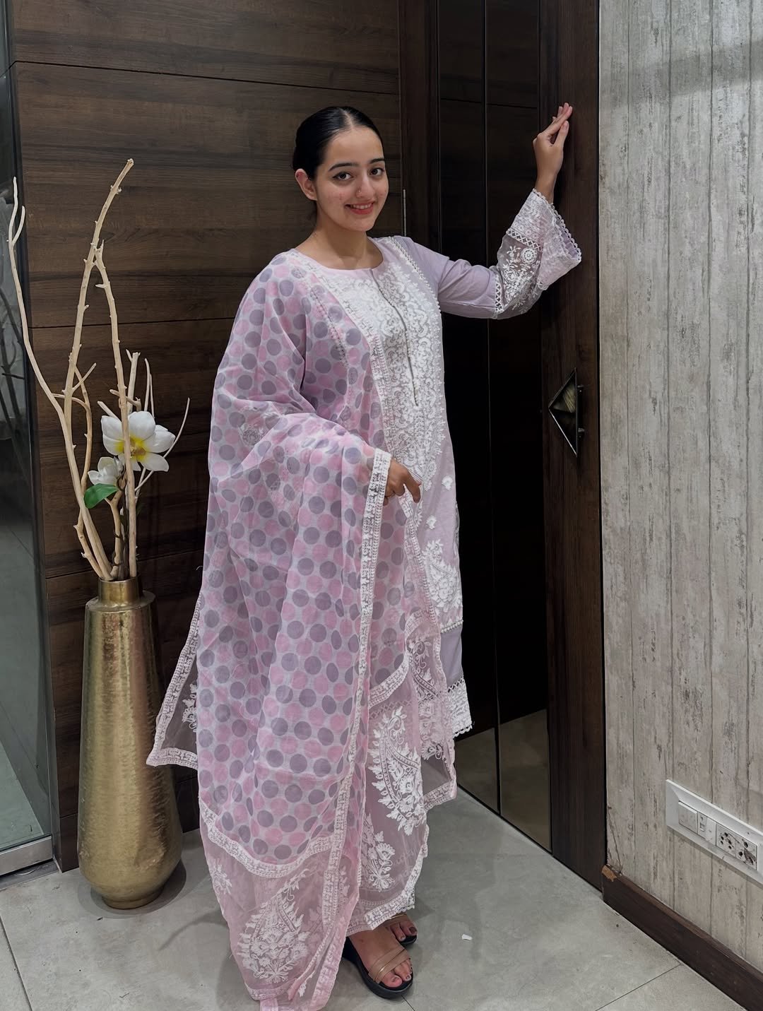 Bring effortless grace to your everyday wardrobe with this pastel green suit set crafted from soft cotton. The kurta is adorned with intricate white thread embroidery on the front panel and lace detailing on the sleeves. It is paired with matching pants and an elegant organza dupatta featuring multicolor dot print and embroidery panels. A perfect choice for comfort and sophistication.