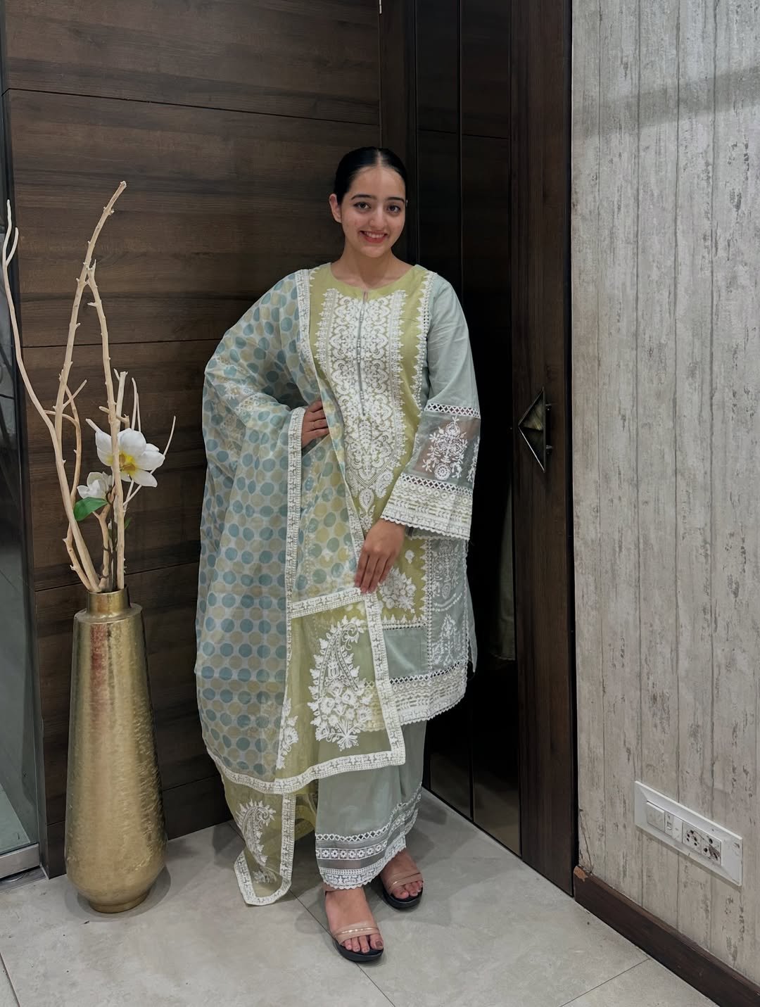 Bring effortless grace to your everyday wardrobe with this pastel green suit set crafted from soft cotton. The kurta is adorned with intricate white thread embroidery on the front panel and lace detailing on the sleeves. It is paired with matching pants and an elegant organza dupatta featuring multicolor dot print and embroidery panels. A perfect choice for comfort and sophistication.