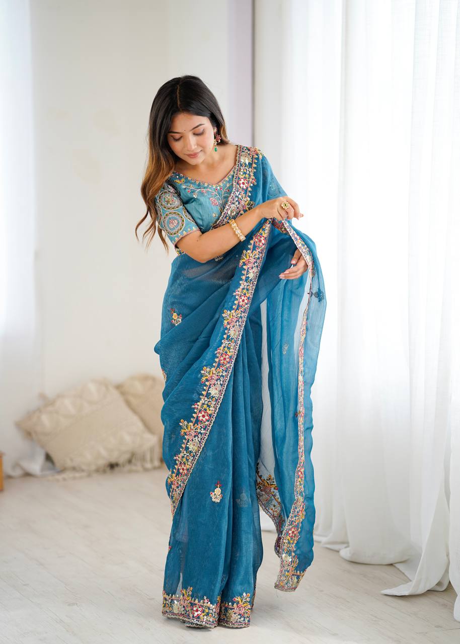 🥻 Sari Fabric: Premium Crunchy Silk With Heavy Embroidery Threads 🧵 Codding & Sequins Work