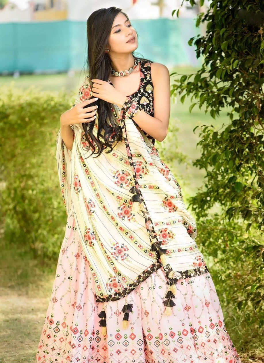Lehenga : Heavy Butter Silk With Beautiful Hand Print With Real Mirror Work